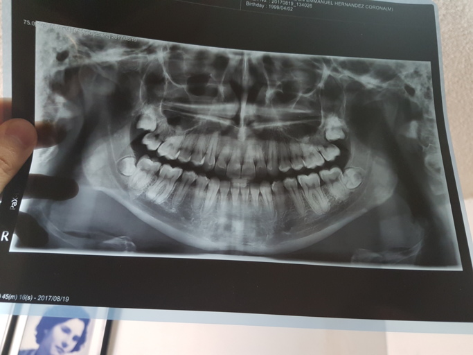 Hi, I'm Brandon, 19 year old. I am currently in this situation: I got removed dental braces for about 3 years ago. At that time, my dentist sent me to take a panoramic radiography just to check out if wisdoom teeth were correctly after braces. His conclusion was that he recommend me to extraxt the 4 wisdom teeth with a surgeon just to prevent any future complications. I didn't do anything at the time, just waited for any future pain or something, because i really didn't think the wisdom teeth extraction necesary. So I took another radiography a year ago (August 2017, in the image attached) just to check them with the surgeon. He told me the same old story, a recommendation to extract them, but this time, I GOT SCARED 'CAUSE the surgeon warned me that in the extraction it was little possibility to damage the down nerve of my mouth and also the sinus bone near the upper wisdom. I felt almost decided to extract them until that warning from the surgeon. So I recently got another surgeon opinion and it was totally the opposite, he told me he wouldn't care about nerve damage in extraction because all wisdom teeth were out of warning zones. Finally I got to mention that i have often aura migraines (1 or 2 per month) since a year. I found on the internet that ATM disfunction, wisdom teeth and other things can cause migraines, even false migraines with aura or something, but actually no surgeon or physician could relate both things (wisdom teeth and migraines). Actually I also have problems with hearing on my right side ear and my right side nose since 2 year or so, i mean i feel like clogged or congestioned like allergy.