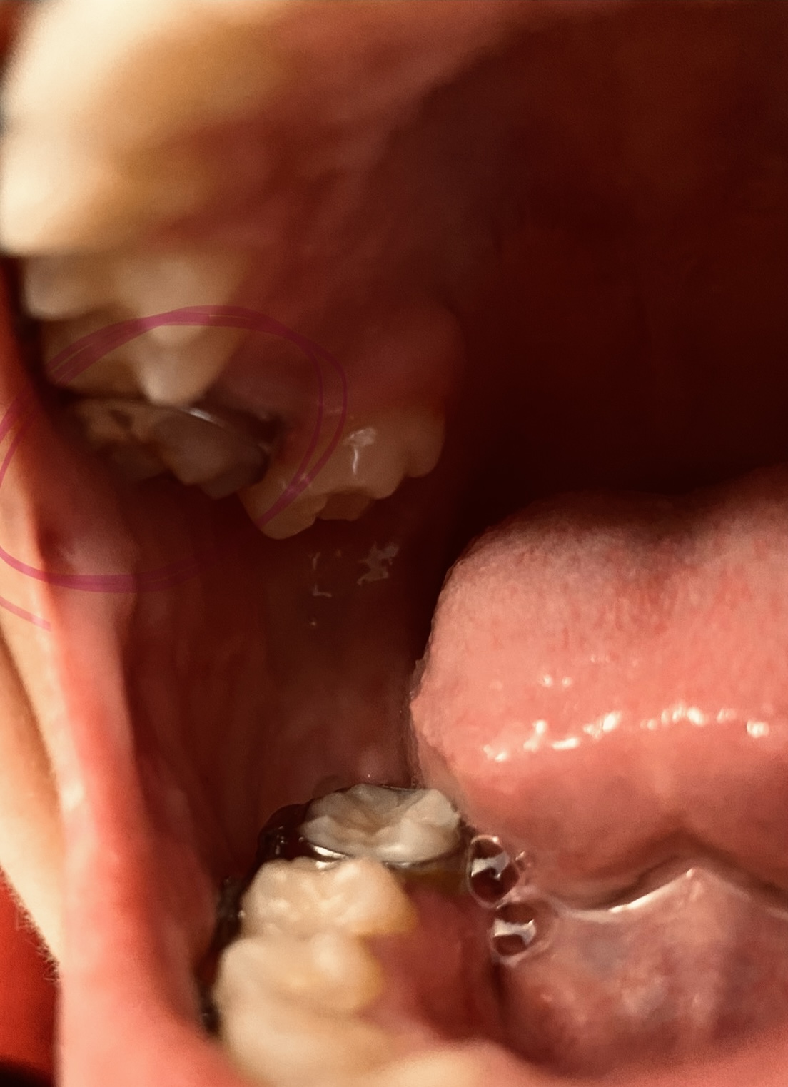 Okay so, to explain this I have over crowding in my bottom front set of teeth. Whats happened is you know you have the front 4 teeth, one of the middle teeth to be exact the right middle one has been pushed back into my mouth behind the other 3....